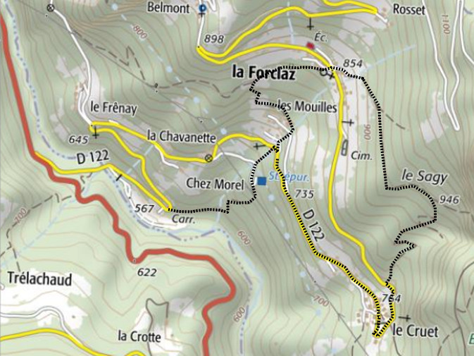 | Chalets rencontrés : Aucun. | Lieux-dits traversés: Le Cruet, Les Mouilles (la Forclaz), Le Sagy. |