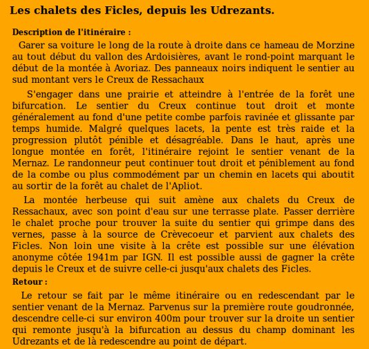 | Chalets rencontrés : L'Apliot, Le Creux de Ressachaux, Les Ficles. | Lieux-dits traversés: Aucun. |