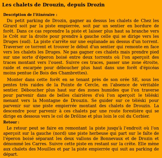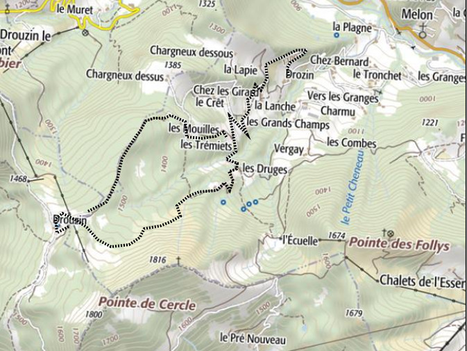 | Chalets rencontrés : Chez les Girard, Chalets de Drouzin, Les Mouilles. | Lieux-dits traversés: les Carres, Bois des Chambrettes, Montagne de Drouzin. |