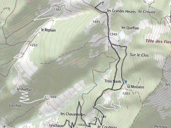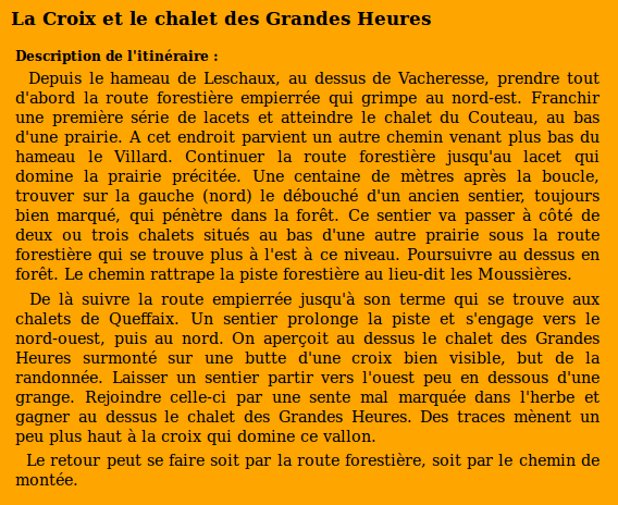 | Chalets rencontrés : Les Grandes Heures, Les Queffaix, Les Trois Nants. | Lieux-dits traversés: Leschaux. |