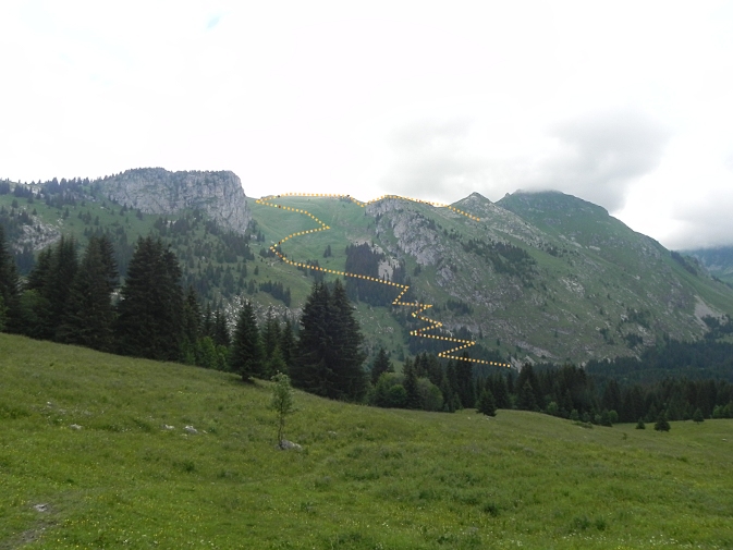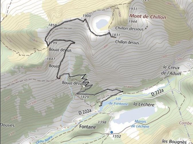 | Chalets rencontrés : Le Bouaz, Chalet le Bouaz d'en Haut, Chalets de Fontaine, Chalet de Chillon dessus. | Lieux-dits traversés: Lac de Fontaine. |