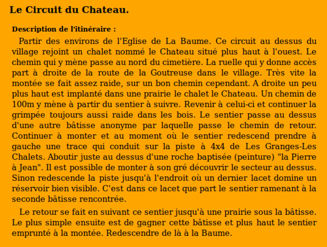 | Chalets rencontrés : Chalet le Chateau. | Lieux-dits traversés: La Baume et environs. |