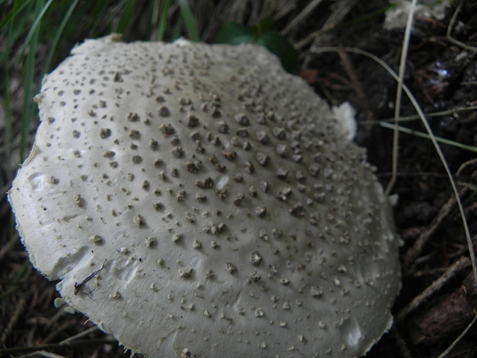 | Famille des Amanitacées | Chapeau blanc couvert de verrues pyramidales détachables  Lames blanches à jaune-verdâtre clair  Pied blanc bulbeux, à squames retroussées. Anneau membraneux  Pousse dans les bois secs, les parcs en terrain calcaire  |