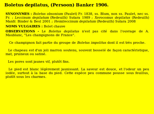 | Bolet chauve | Nom latin (Maublanc ou antérieur) : Boletus depilatus Nom latin actuel : Boletus depilatus |