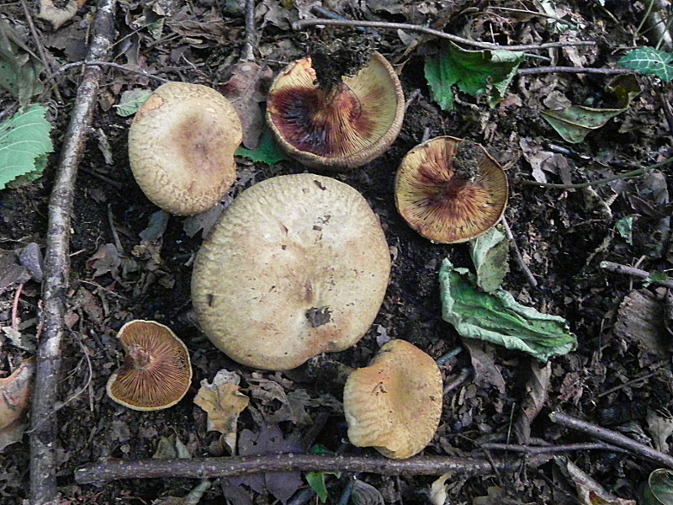 | Famille des Paxillacées | Chapeau ocre roux, creusé en entonnoir, marge enroulée  Lames jaunes se tachant de rougeâtre  Pied jaune taché de roussâtre  pousse sous les aulnes  |