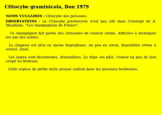 | Clitocybe des pelouses | Nom latin (Maublanc ou antérieur) : Clitocybe graminicola Nom latin actuel : Clitocybe graminicola |