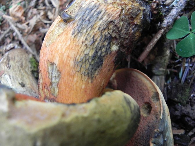 | Famille des Bolétacées | Pied jaune, plus ou moins teinté de rouge.  Chapeau brun-olive à brun rouillé.  Tubes jaunes, bleuissant ou verdissant.  Chair rouge-orangée.  |
