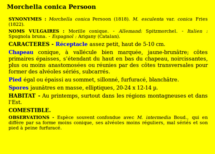 | Morille pourpre | Nom latin (Maublanc ou antérieur) : Morchella conica Nom latin actuel : Morchella conica f. purpurascens |