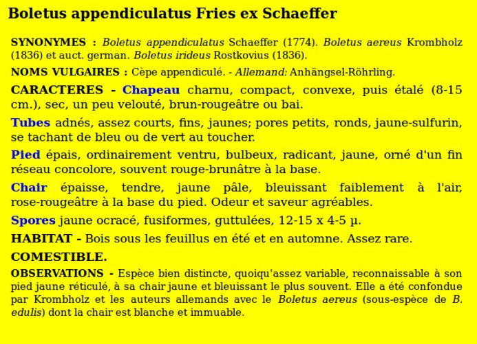 | Bolet appendiculé | Nom latin (Maublanc ou antérieur) : Boletus appendiculatus Nom latin actuel : Boletus appendiculatus |