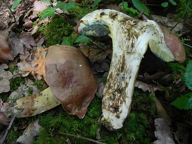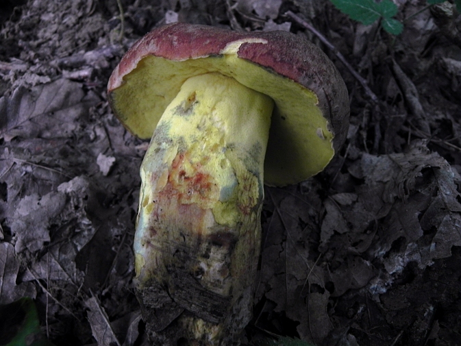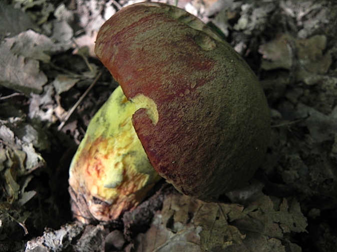 | Famille des Bolétacées | Pied jaune, dur et radicant.  Chapeau brun-rougeâtre.  Tubes jaunes bleuissant ou verdissant légèrement au toucher.  Espèce ferme, avec parfois un peu de rosâtre sur le pied.  |