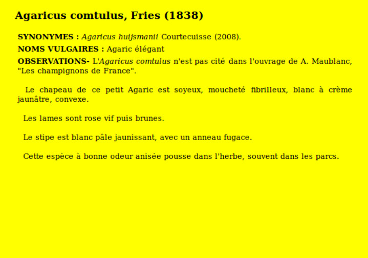 | Agaric élégant | Nom latin (Maublanc ou antérieur) : Agaricus comtulus Nom latin actuel : Agaricus comtulus |