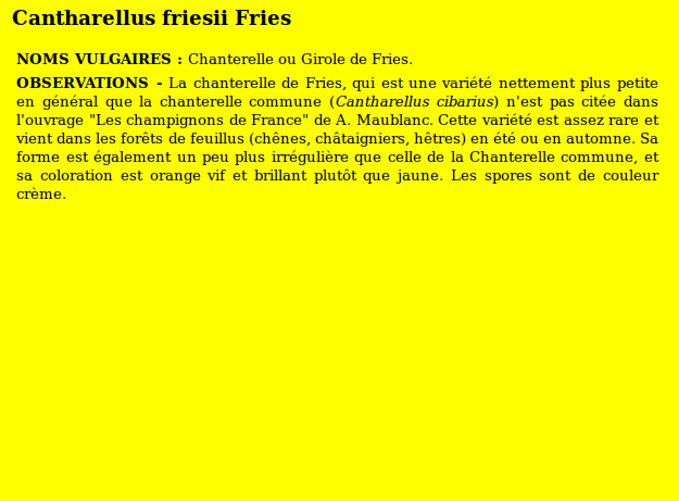 | Chanterelle de Fries | Nom latin (Maublanc ou antérieur) : Cantharellus friesii Nom latin actuel : Cantharellus friesii |