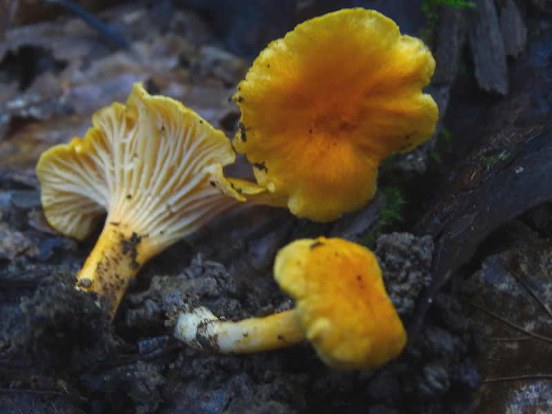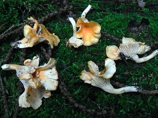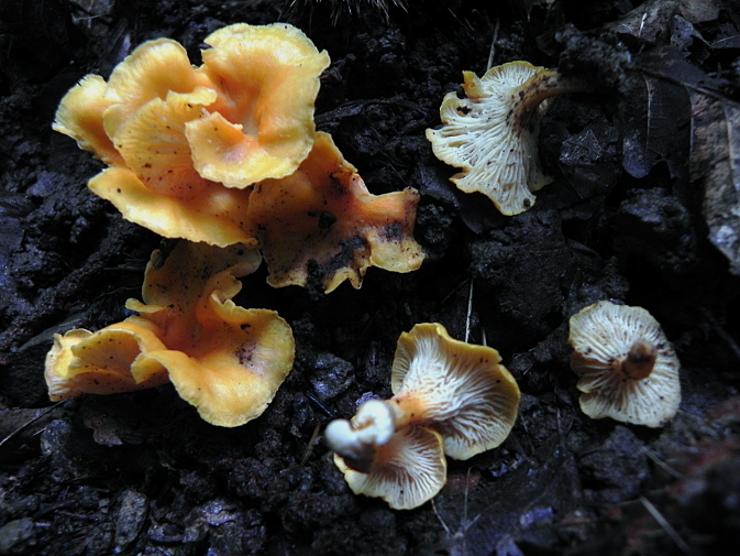 | Famille des Cantharellacées | Pied ferme, mais grêle, jaune-orangé.  Chapeau orangé brillant , surtout au centre.  Plis décurrents, de la même couleur que le chapeau.  Pousse sous les feuillus. Rare  |