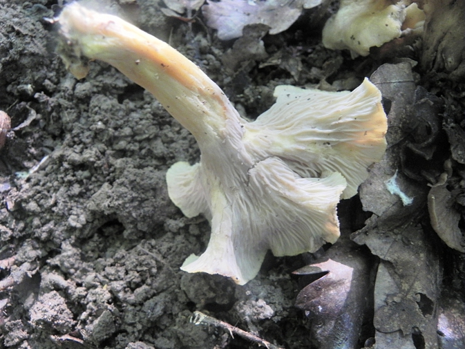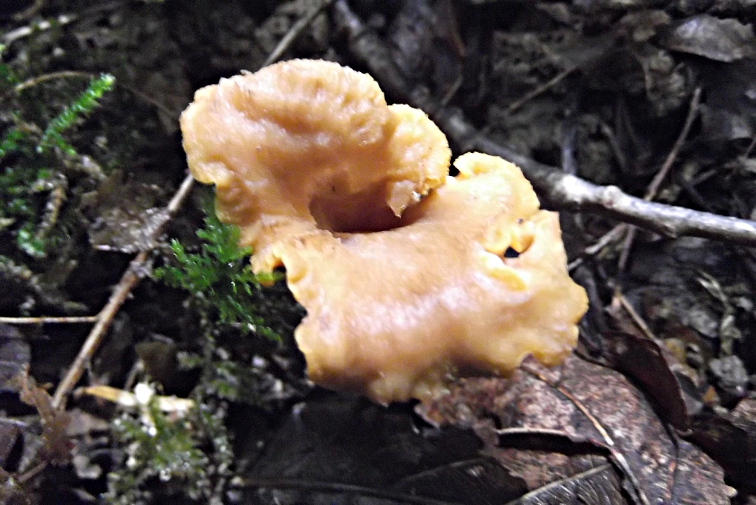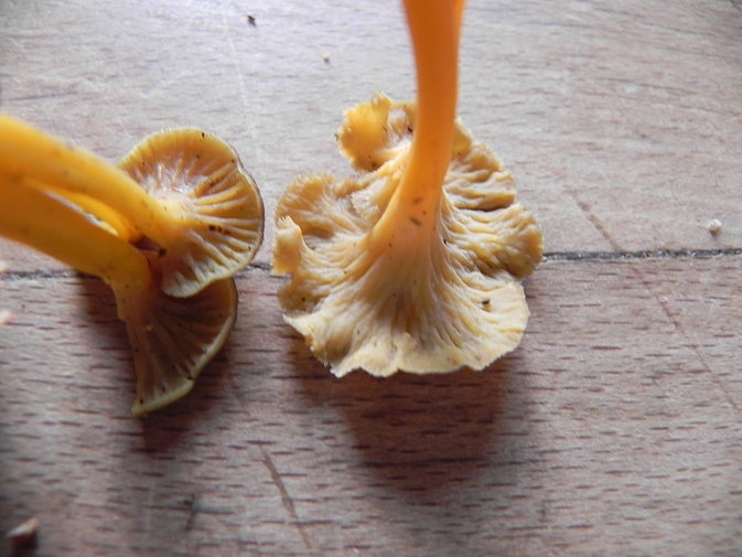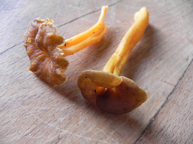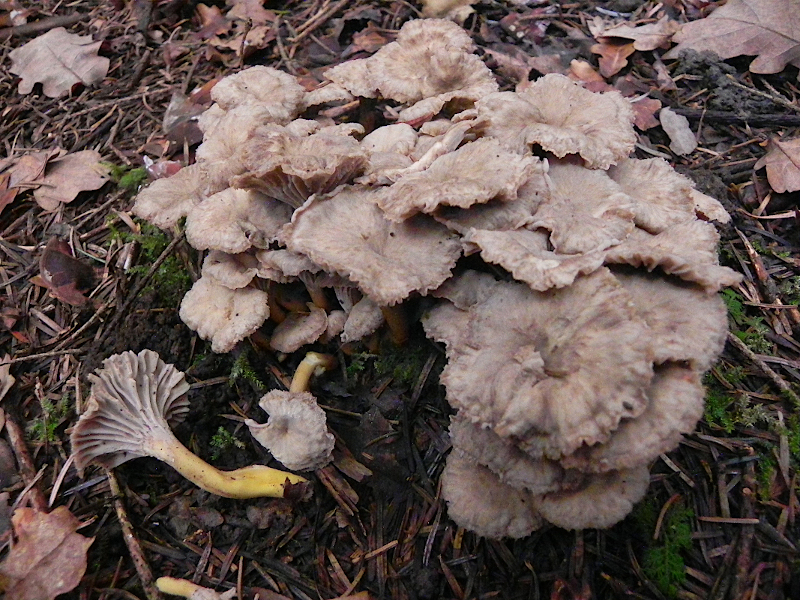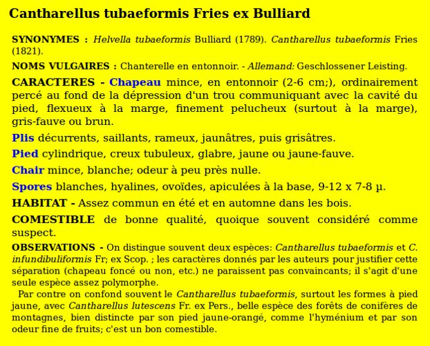 | Famille des Cantharellacées | Pied jaune-fauve, un peu sombre. Plis très nets, grisés.  Chapeau en entonnoir, brun jaunâtre.  Les photos 3 et 4 montrent la sous-variété lutescens (ne pas confondre avec l'espèce lutescens)  Photo 1, l'espèce tubaeformis est à droite et l'espèce lutescens à gauche. 2 : l'inverse.  |