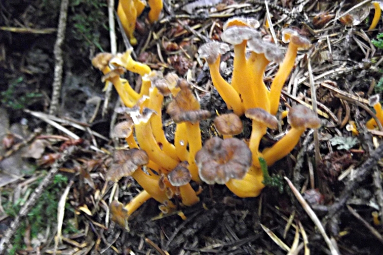 | Famille des Cantharellacées | Pied d'un beau jaune orangé.  Chapeau plutôt brun jaunâtre. Odeur fruitée.  Sous le chapeau on observe des rides orangées et non des lamelles.  Pousse surtout sous les pins.  |