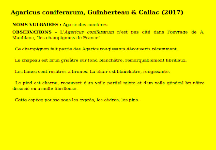 | Agaric des conifères | Nom latin (Maublanc ou antérieur) : Agaricus coniferarum Nom latin actuel : Agaricus coniferarum |