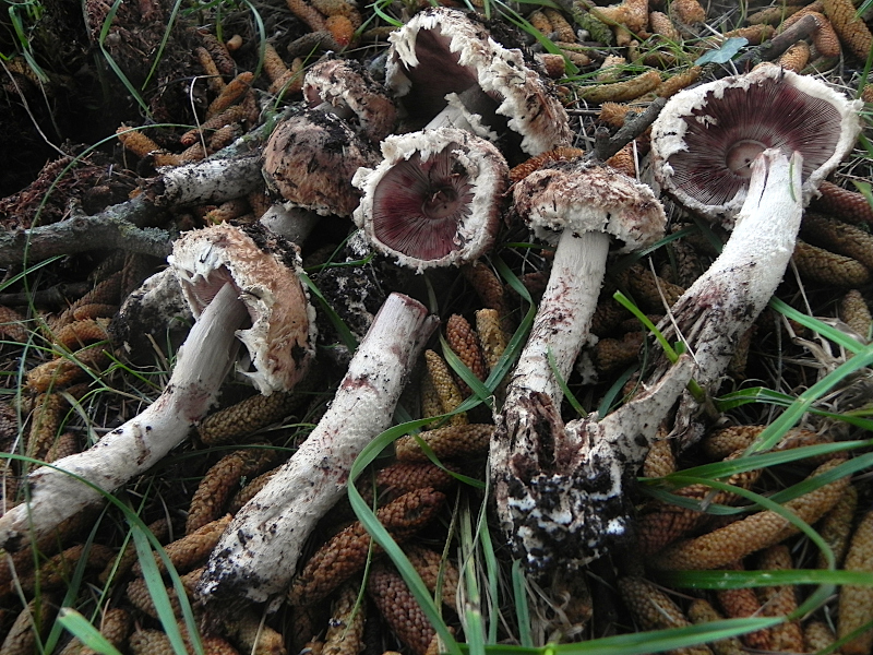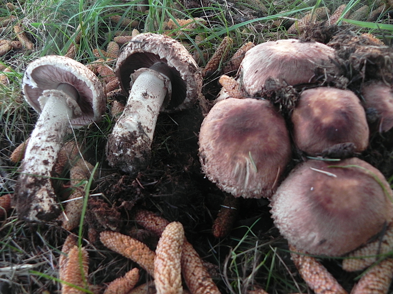 | Famille des Agaricacées | Chapeau gris-brun très fibrilleux, sur fond blanchâtre  Lames roses puis brunes. Chair blanchâtre, rougissante  Pied couvert de restes du voile, en armille  Pousse sous cyprès, cèdre, pin  |