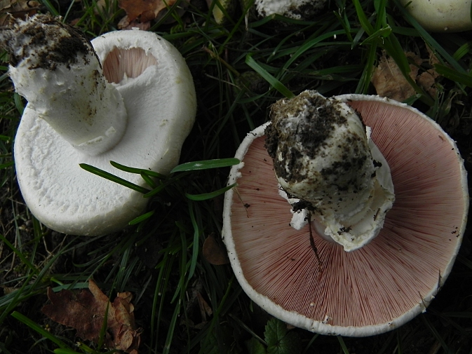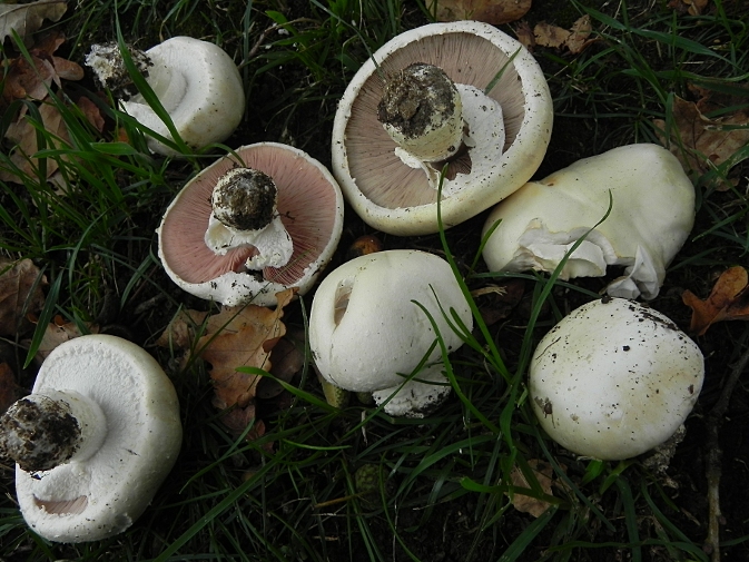| Famille des Agaricacées | Pied blanc, muni d'un anneau double.  Chapeau blanc, d'abord globuleux puis plan.  Lamelles blanchâtres, puis rosées enfin bistre-pourpre  Croit en troupes dans les prés.  |