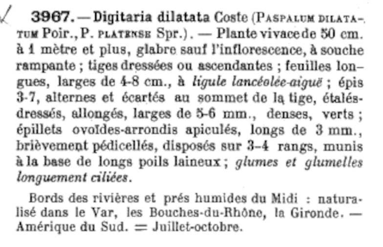 | Millet bâtard | Nom latin : Digitaria dilatata (Coste) Paspalum dilatatum (actuel) |