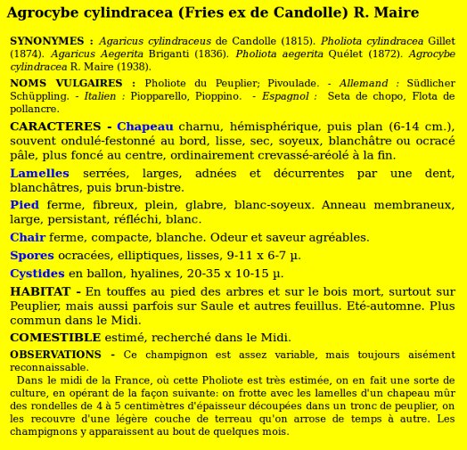 | Pholiote du peuplier | Nom latin (Maublanc ou antérieur) : Agrocybe aegerita Nom latin actuel : Cyclocybe cylindracea |