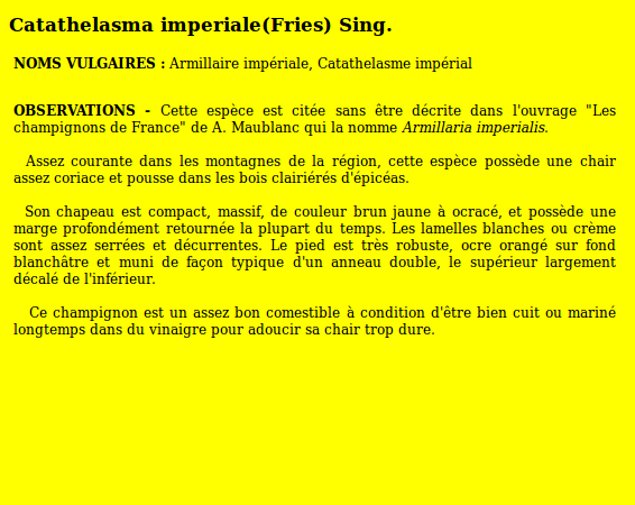 | Armillaire impériale | Nom latin (Maublanc ou antérieur) : Catathelasma imperiale Nom latin actuel : Catathelasma imperiale |