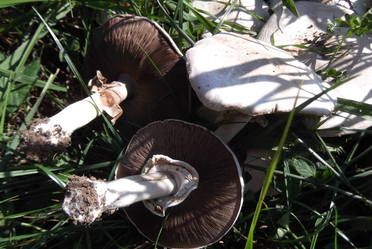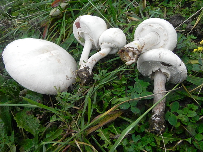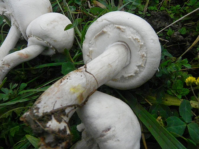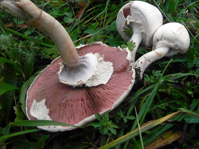 | Famille des Agaricacées | Pied blanc, se tachant de jaune au toucher. Anneau ample  Chapeau blanc ou teinté de marron au sommet  Lames blanches puis roses vif puis brun-pourpre foncé  Chair jaunissant surtout dans le bulbe  |