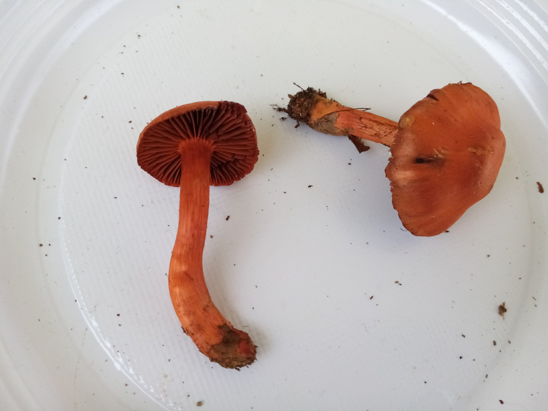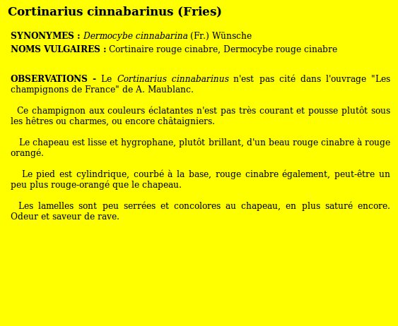 | Famille des Cortinariacées | Pied rouge cinabre à rouge orangé  Lamelles rouge cinabre saturé, peu serrées  Chapeau lisse, hygrophane, rouge cinabre  Odeur et saveur de rave. Pousse sous les hêtres ou châtaigniers  |