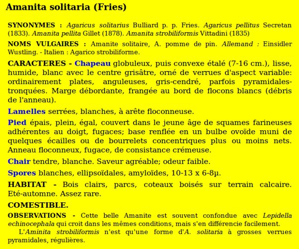 | Amanite solitaire | Nom latin (Maublanc ou antérieur) : Amanita strobiliformis Nom latin actuel : Amanita strobiliformis |