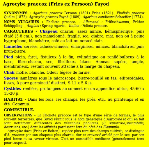 | Agrocybe précoce | Nom latin (Maublanc ou antérieur) : Agrocybe praecox Nom latin actuel : Agrocybe praecox |