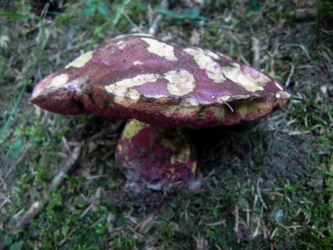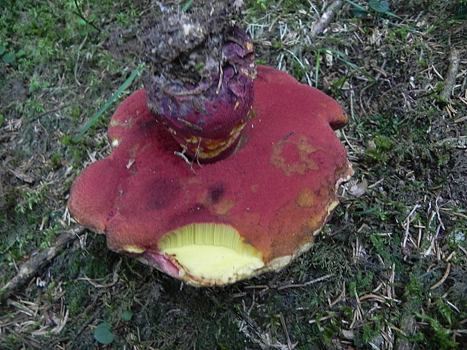 | Famille des Bolétacées | Chapeau rose, jaune dans les blessures  Tubes rouge sang, chair jaune sous les tubes, bleuissant lentement et peu  Pied concolore aux tubes.   Pousse en terrain acide  |