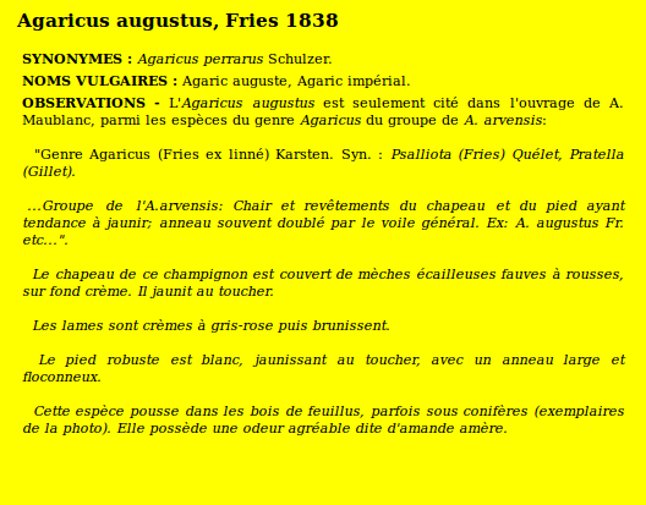 | Agaric auguste | Nom latin (Maublanc ou antérieur) : Agaricus augustus Nom latin actuel : Agaricus augustus |