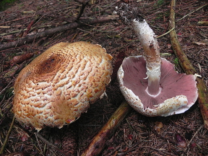 | Famille des Agaricacées | Chapeau couvert de mèches roussâtres sur fond crème, jaunissant au toucher  Lames blanc-grisâtres, puis roses, puis brunes. Odeur d'amande amère  Pied blanc, muni d'un ample anneau floconneux, jaunissant au toucher  Pousse sous feuillus ou conifères, suivant les variétés  |