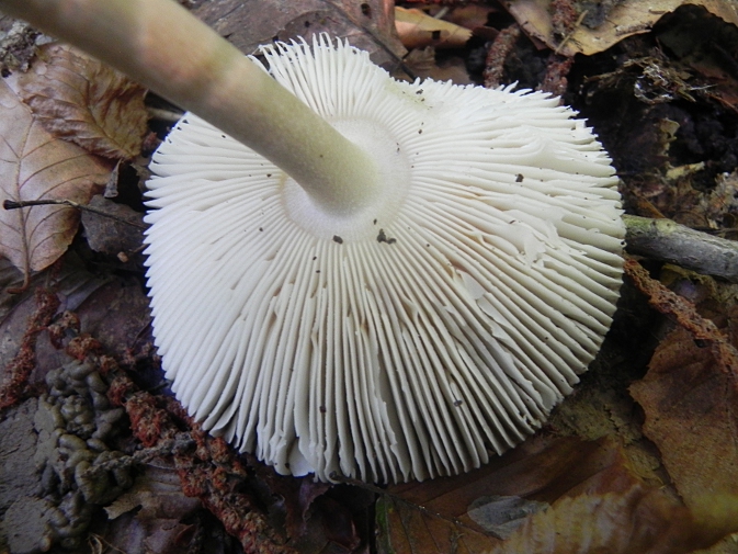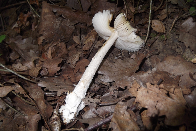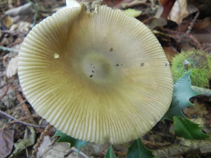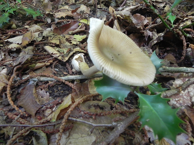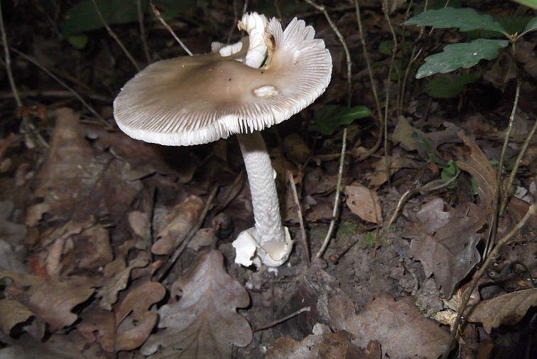 | Famille des Amanitacées | Pied long, grêle. Volve persistante blanche en étui.  Chapeau campanulé puis plan, strié au bord.  Lamelles blanches.  Espèce très variable.  |