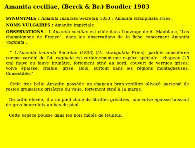 | Amanite impériale | Nom latin (Maublanc ou antérieur) : Amanita ceciliae Nom latin actuel : Amanita ceciliae |