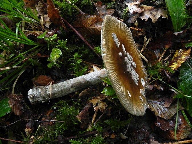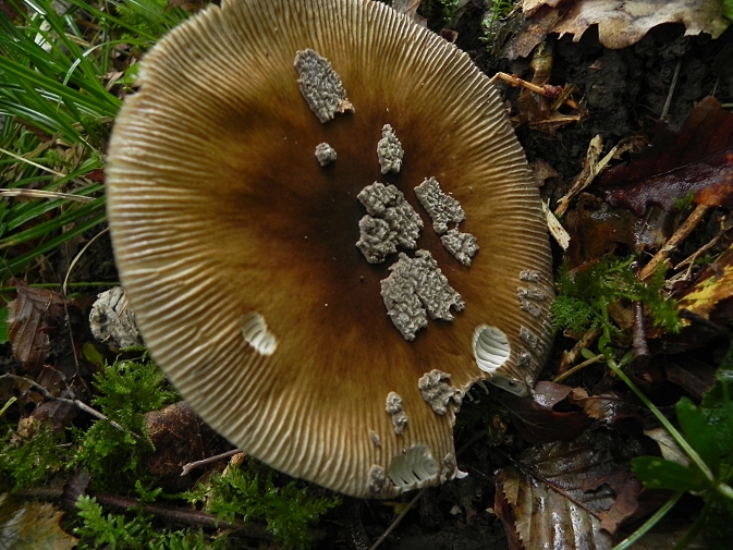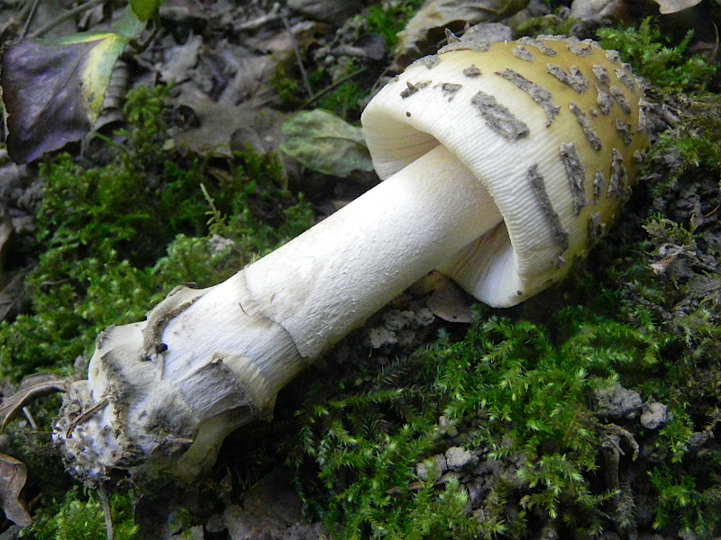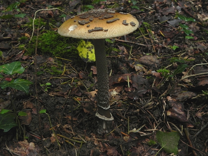 | Famille des Amanitacées | Chapeau brun fauve olivacé, couvert de verrues grises  Lames peu serrées, blanc-grisâtres  Pied élevé, tigré à peluché de gris, avec une volve épaisse grise en bourrelets  Pousse sous les feuillus  |