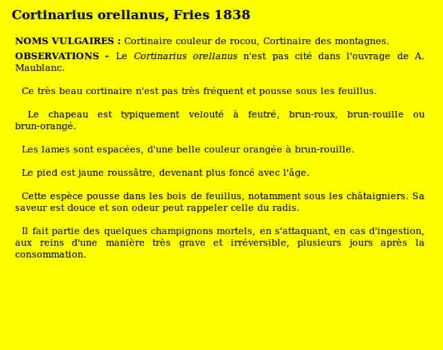 | Cortinaire des montagnes | Nom latin (Maublanc ou antérieur) : Cortinarius orellanus Nom latin actuel : Cortinarius orellanus |