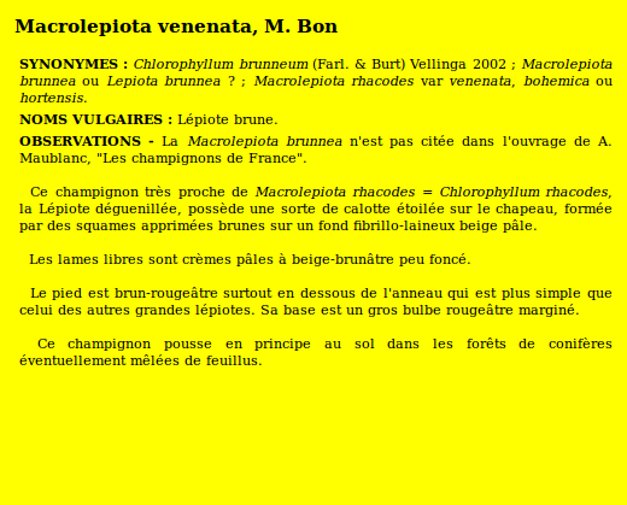 | Lépiote brune | Nom latin (Maublanc ou antérieur) : Macrolepiota venenata Nom latin actuel : Chlorophyllum brunneum |