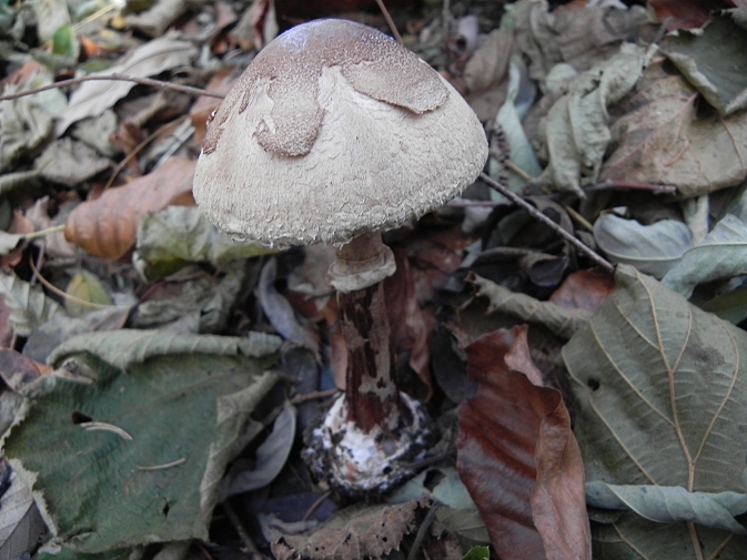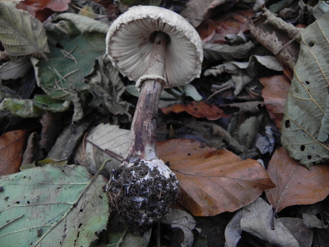 | Famille des Lépiotées | Chapeau revêtu d'une calotte en étoile brune sur fond fibrillo-laineux  Lames crème à beige brunâtre clair  Pied brun-rougeâtre avec un anneau simple et un gros bulbe marginé rougeâtre  Pousse dans les forêts de conifères mêlées de feuillus  |