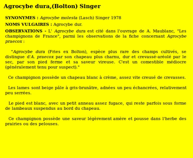 | Agrocybe dur | Nom latin (Maublanc ou antérieur) : Agrocybe dura Nom latin actuel : Agrocybe dura |