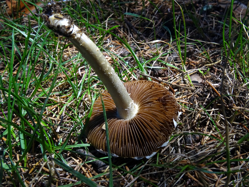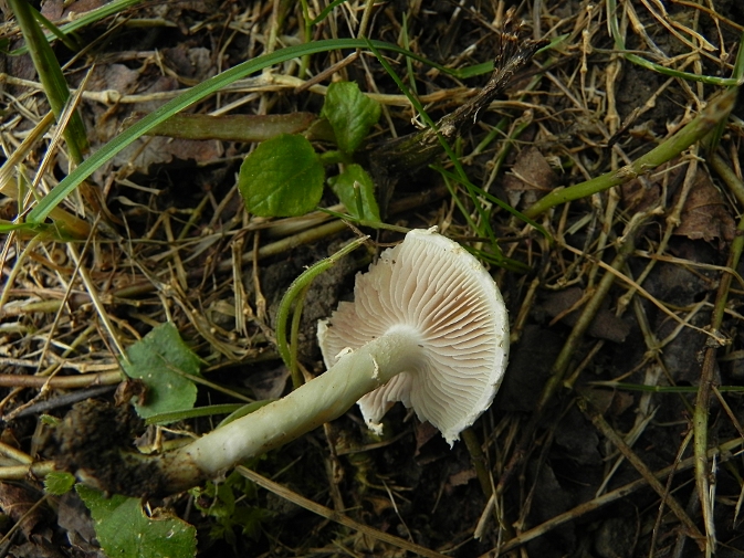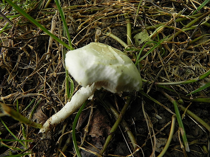 | Famille des Bolbitiacées | Chapeau blanc crème, vite crevassé  Lames peu serrées, adnées échancrées, beige à gris-brunâtre  Pied blanc avec un petit anneau restant parfois accroché au bord du chapeau  Pousse dans l'herbe des prairies  |
