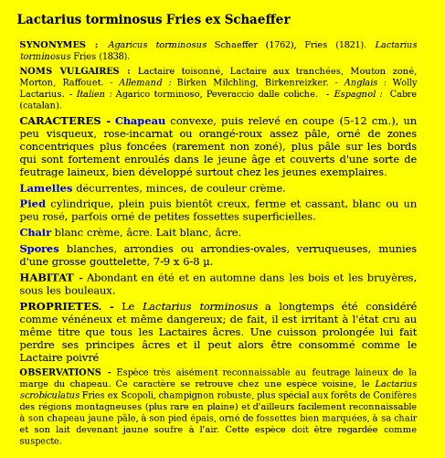 | Lactaire à toison | Nom latin (Maublanc ou antérieur) : Lactarius torminosus Nom latin actuel : Lactarius torminosus |