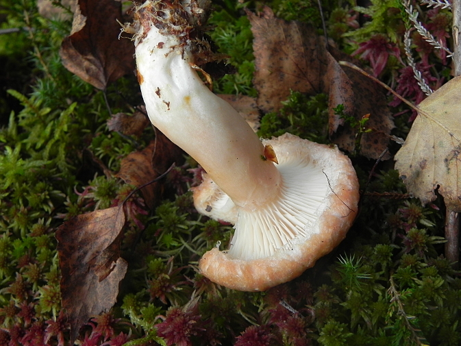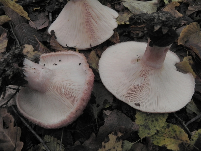| Famille des Russulacées | Pied blanc, un peu rosé.  Chapeau rose-incarnat. Marge couverte d'un feutrage laineux.  Lamelles décurrentes crème.  Lait blanc et âcre.  |