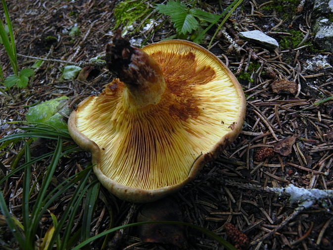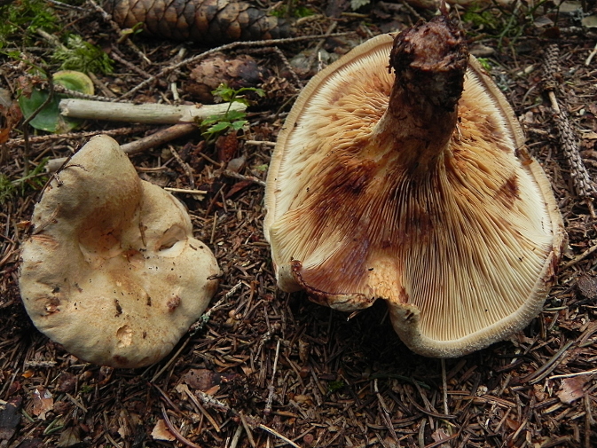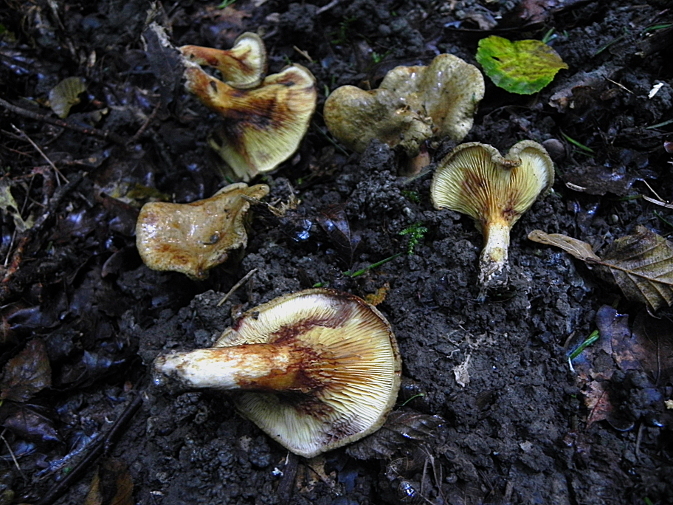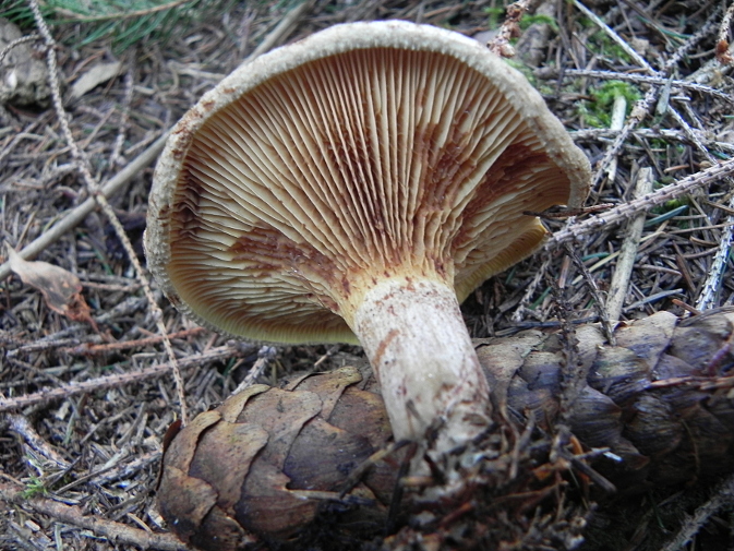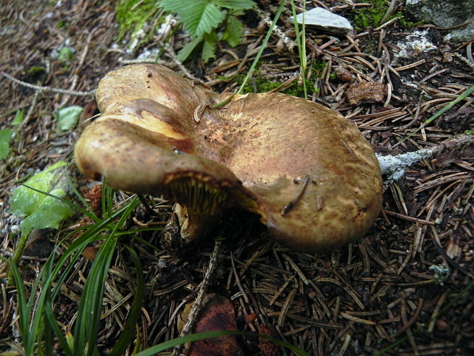 | Famille des Agaricacées | Chapeau un peu en entonnoir, brun à fauve-ocracé. Marge très enroulée  Lames décurrentes, serrées, ocre-jaunâtre, se tachant de brunâtre  Pied robuste, court, brun-jaune-olivâtre  Pousse sous les épicéas  |