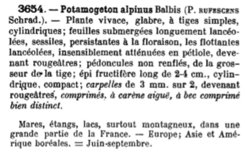 | Potamot alpin | Nom latin : Potamogeton alpinus (Coste) idem (actuel) |