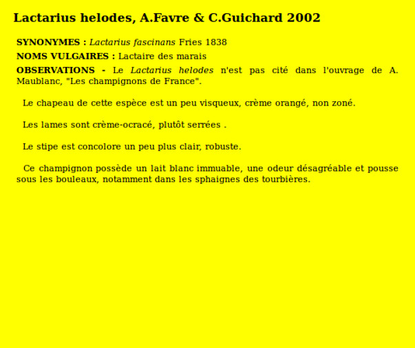| Lactaire des marais | Nom latin (Maublanc ou antérieur) : Lactarius helodes Nom latin actuel : Lactarius helodes |