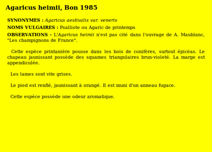 | Agaric de printemps ? | Nom latin (Maublanc ou antérieur) : Agaricus heimii Nom latin actuel : Agaricus heimii |