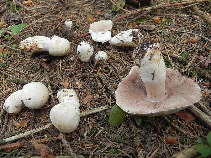 | Famille des Agaricacées | Chapeau jaunissant, à marge appendiculée et squames brun-violet  Lames vite grises. Odeur aromatique  Pied renflé, jaunissant. Anneau fugace  Pousse au printemps sous épicéas surtout  |