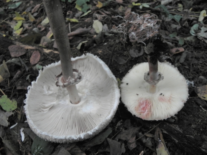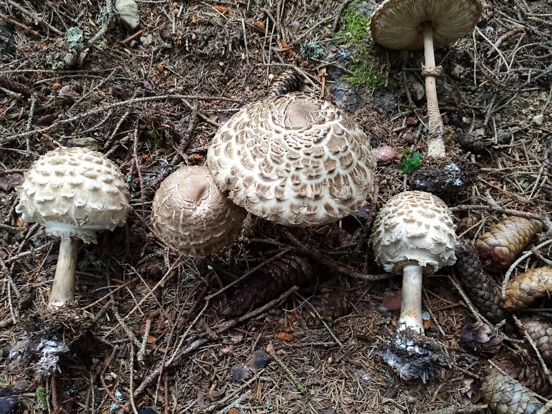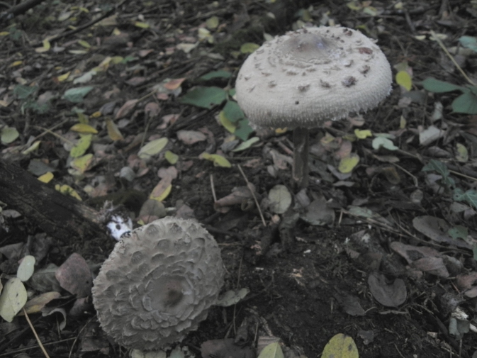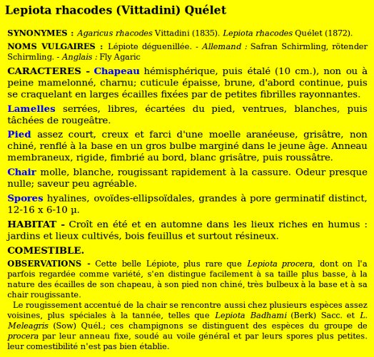 | Famille des Lépiotées | Pied non chiné, moins grand que celui de procera. Anneau coulissant  Chapeau épais, craquelé en larges écailles fixées à la cuticule.  Lamelles serrées, rougissant rapidement à la cassure.  Photos de rhacodes 1 - par terre . 2-3 tâché de rouge safran (autre = procera)  |