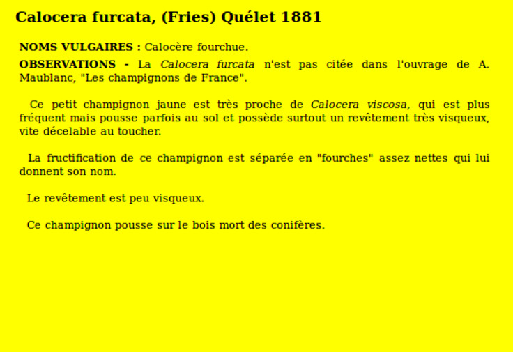 | Calocère fourchue | Nom latin (Maublanc ou antérieur) : Calocera furcata Nom latin actuel : Calocera furcata |