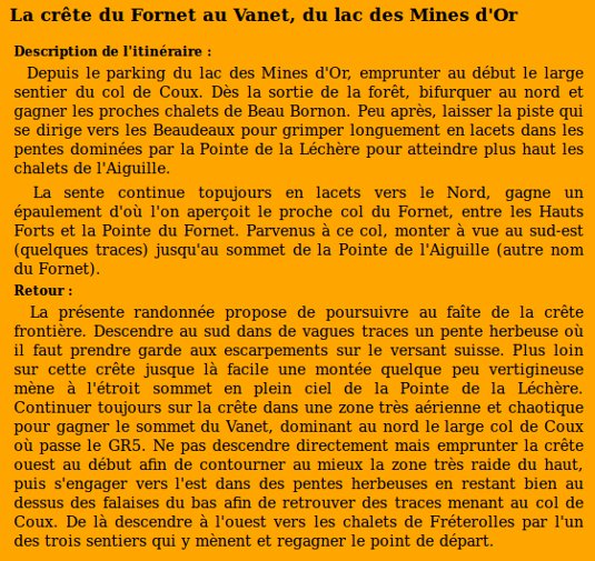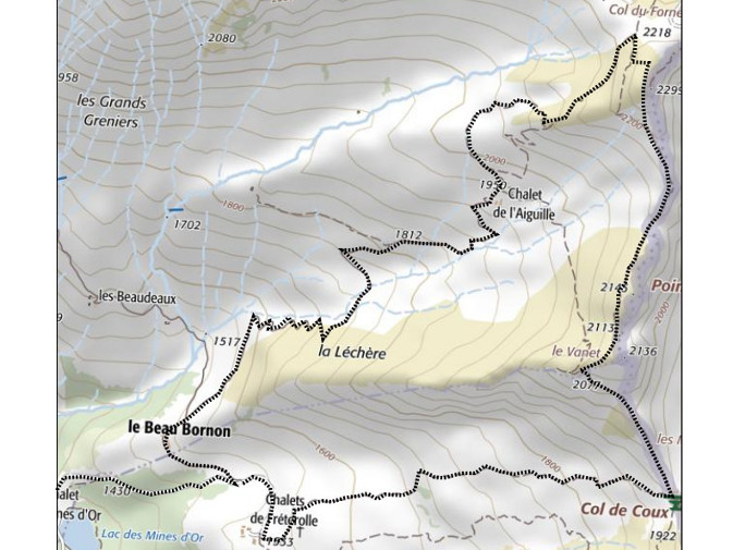 | Sommet(s) franchi(s) : Pointe de Fornet, Pointe de la Léchère, Le Vanet. | Col(s) franchi(s) : Col de Coux, Col du Fornet. |